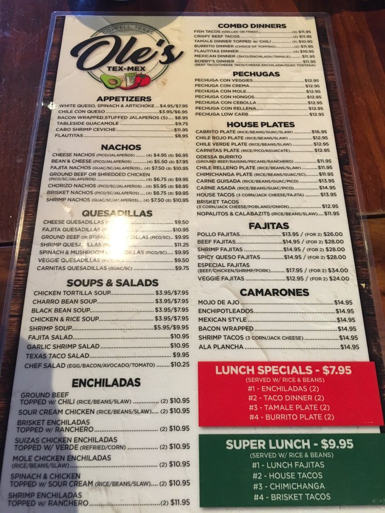 Welcome to Ole's Tex Mex, where the heart of Tex-Mex cuisine beats vibrantly in Coppell, TX. This cozy establishment offers a menu brimming with flavors and options, catering to everyone from meat lovers to health-conscious diners. Indulge in their savory Chicken Tortilla Soup or the refreshing Garlic Shrimp Salad, each crafted with fresh ingredients and generous portions.